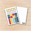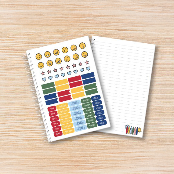 Miolo, capas, cartela de adesivo e estampas para produzir cadernos A5 e 17,4 x 26cm